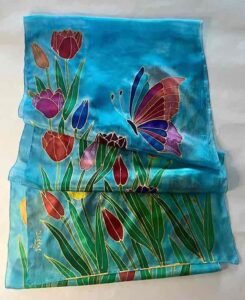 Milyen selyemre festesz? Minden alkotásomat kizárolag prémium minôségû hòfehér hernyóselyemre festem. Elôszeretettel festek Habotai 8-9-es vastagságú selyemre és Crepe de