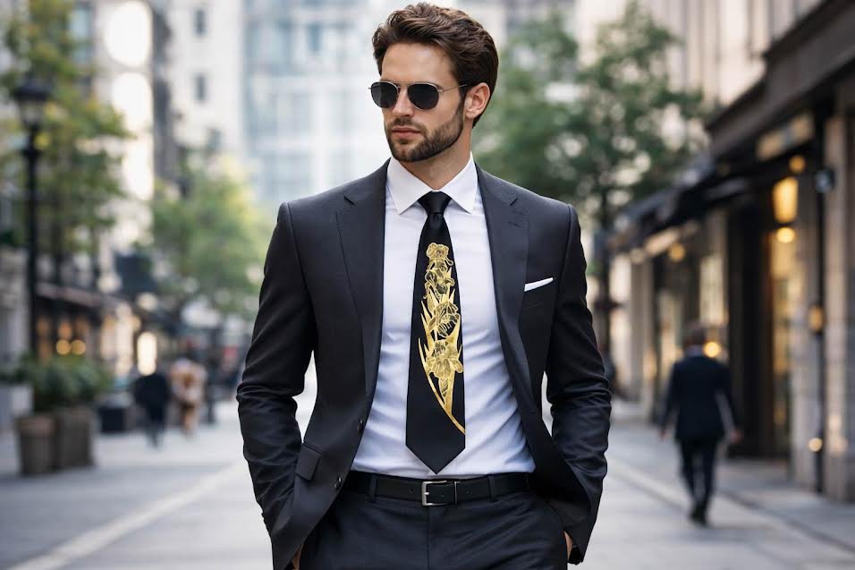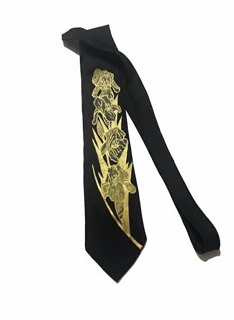 Kézzel festett arany virágminta elegáns és különleges. Olyan, mintha egy mini festmény lenne a nyakkendőn. A mély fekete háttér kiemeli a mintát, így már messziről látszik, hogy viselője szereti az egyedi darabokat.Ez a fekete selyem nyakkendő nem csak egy ruhadarab,hanem egy igazi figyelemfelkeltő ékszer a férfiaknak.