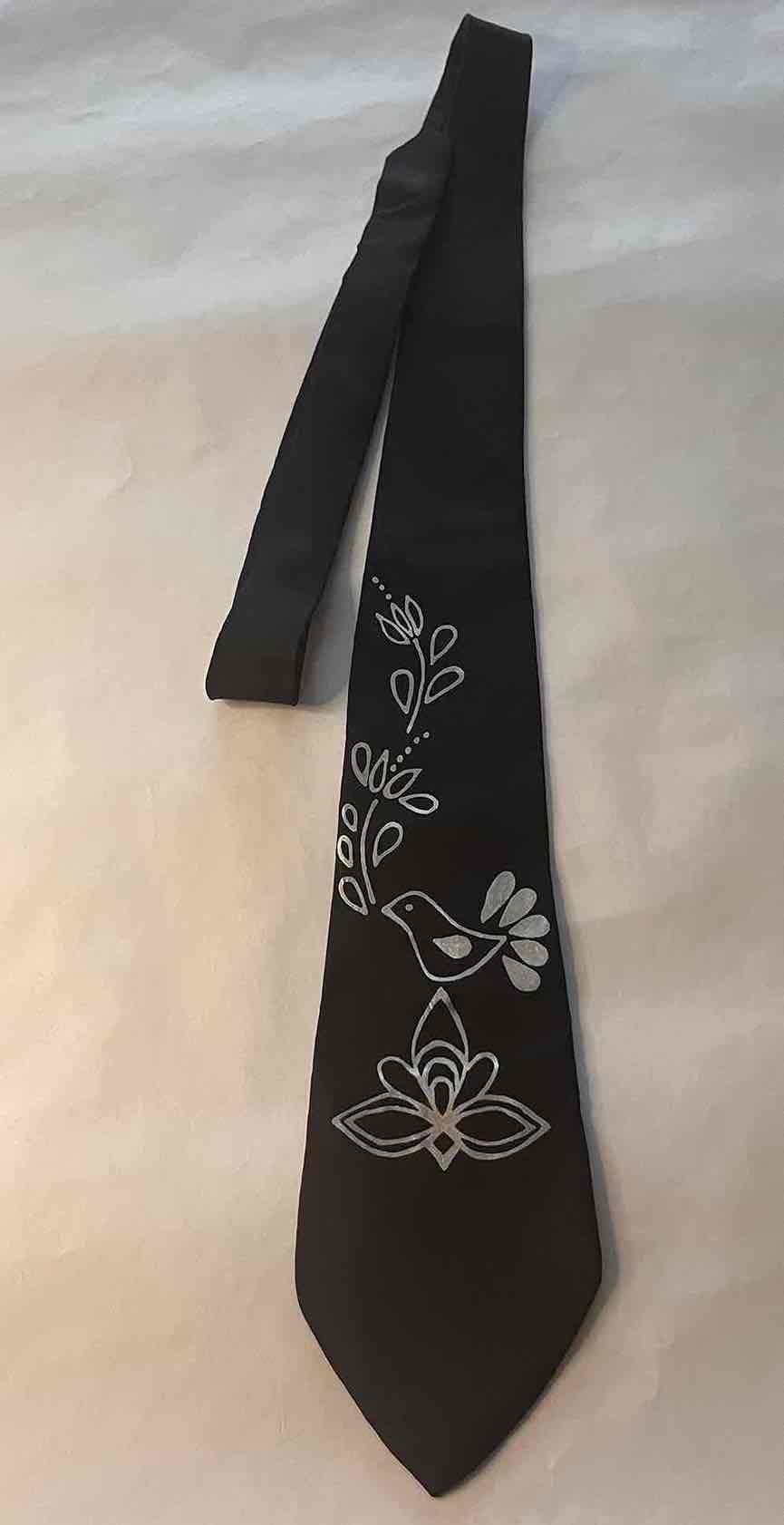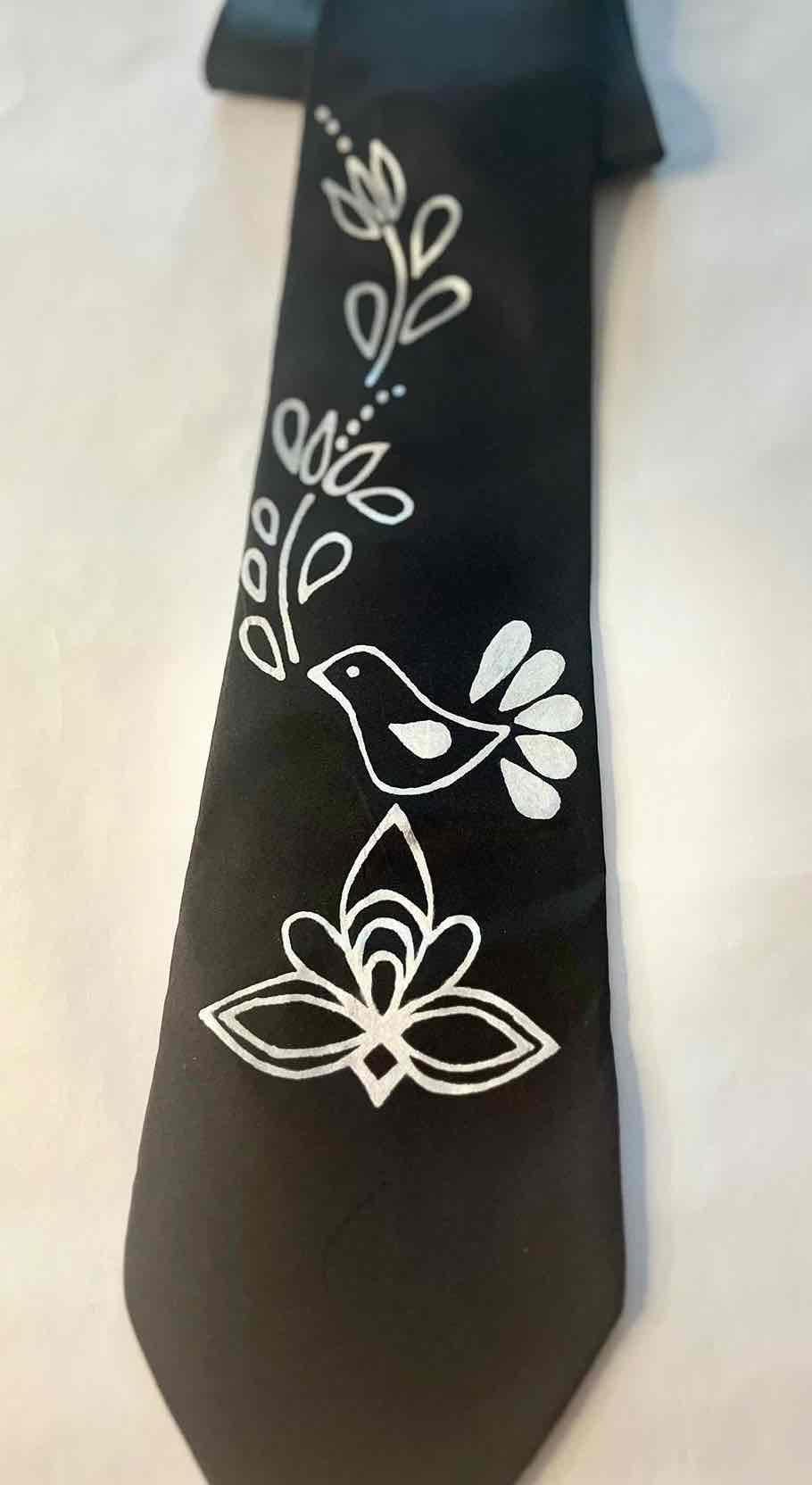 Az „Ősi Hang” egy különleges selyem nyakkendő, melyben találkozik a hagyomány és az időtlen elegancia. Fekete alapon kézzel festett, stilizált matyó motívumok díszítik: egy madár, levelek és virágformák, melyek nemcsak díszítenek, hanem mesélnek is a népművészet ősi nyelvén. A madár a szabadságot, az emelkedettséget, a lélek szárnyalását idézi, míg a finoman megrajzolt vonalak visszafogottan elegánsak. A klasszikus fekete-ezüst színvilág méltóságteljes, ugyanakkor kortárs viseletként is stílusos választás.