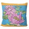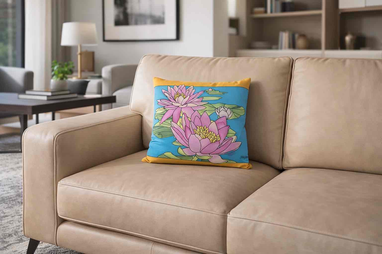 Ez a kézzel festett selyem díszpárna a nyugalom és a természet eleganciáját hozza el az otthonodba. A vízililiomok finom rózsaszín árnyalatai és a mély kék háttér harmonikus kontrasztja azonnal magára vonzza a tekintetet, miközben friss, modern karaktert ad a térnek. A motívum a csendes vízfelület békéjét idézi, így tökéletes választás nappaliba, hálószobába vagy egy hangulatos olvasósarokba.